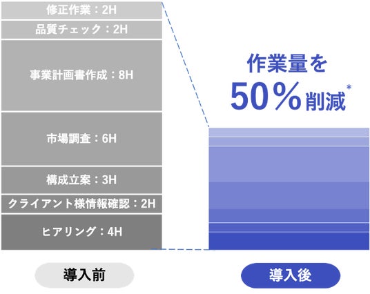 補助金獲得支援における事業計画書作成を、事業分析からライティング、チームコラボレーションまでAIでサポート。業務工数の最大72%削減を実現。特許出願済みの独自生成AI技術を搭載。