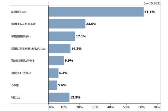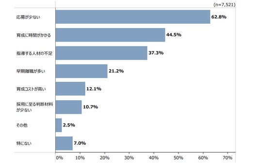次に採用に関する課題について確認すると、「応募が少ない」と回答した企業が最も多く、その割合は6割を超えています。中途採用においては61.1%、新卒採用においては62.8%の中小企業が、応募が少ないことを課題として挙げています(2024年版 中小企業白書)