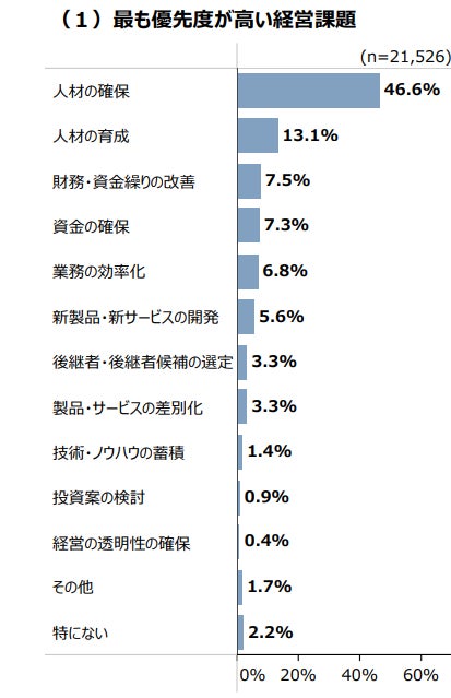 中小企業にとって最も優先度が高い経営課題は「人材の確保」です。この課題を挙げた中小企業は46.6%を占めています(2024年版中小企業白書)