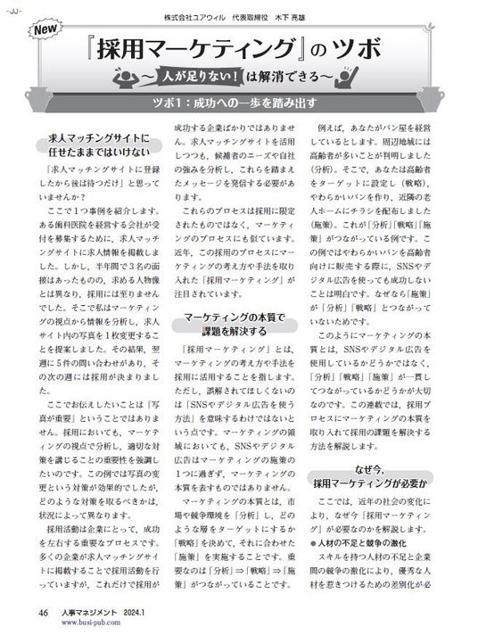 求人広告を活用しても人材確保に悩む中小企業を対象に、これまで経営・人事系の専門誌(合計22誌、今後の予定を含む)に執筆してきた著者が、「採用マーケティングセミナー」を無料開催します。さらに、参加者全員に『月刊 人事マネジメント』の連載記事3回分を無料で提供いたします。