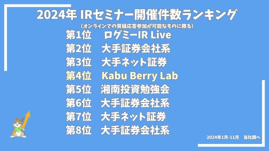 IRセミナー開催数は、双方向のコミュニケーションが可能なオンラインIRセミナーとしては、業界内でもトップレベルの実績となっております。