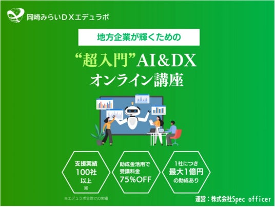株式会社Spec officer(愛知県岡崎市)は、地域みらい総研株式会社(東京都港区)と連携し、DX(デジタルトランスフォーメーション)およびAI研修サービス「岡崎みらいDXエデュラボ」を開始いたします。まずは自社グループ企業向けに研修を提供し、その成果を基に、より広く地域企業や全国企業に向けてサービスを拡大していく予定です。