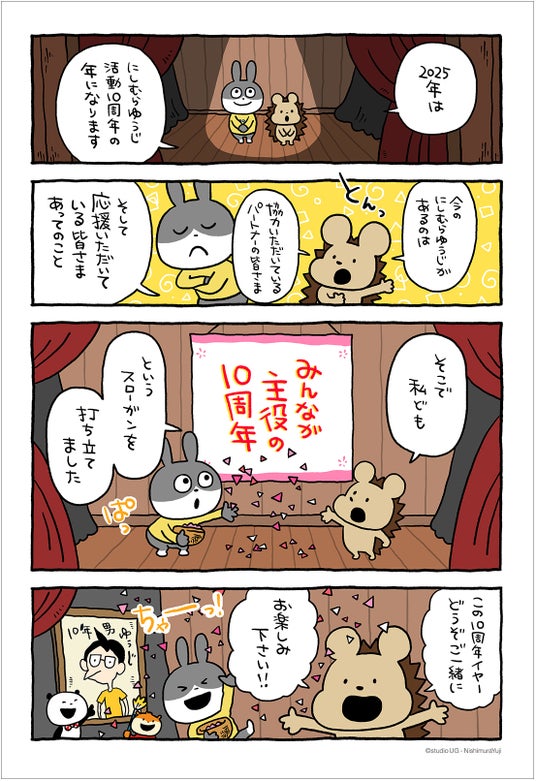 studio UG株式会社(本社:東京都杉並区、代表取締役:にしむらゆうじ・相川 美希)は、にしむらゆうじを支えてくださった方々への感謝の想いを伝えると共に、全員で一緒に盛り上げていく「みんなが主役の10周年」を実施します。