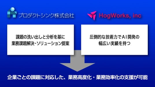 顧客の業務課題の洗い出しや分析を基に最適なソリューション提案を強みに持つプロダクトシンクと、圧倒的な技術力で顧客の課題に対して最適なAIモデルの設計・構築・実装をゼロから行うHogworksが提携することで、