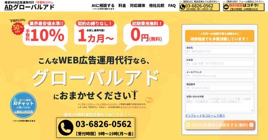 運用手数料10%の【格安】WEB広告運用代行サービス『グローバルアド』のサービスページ画像