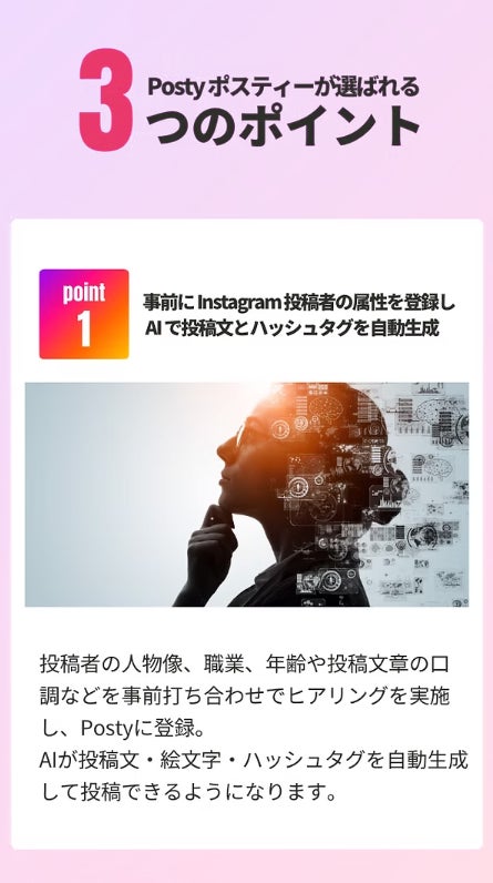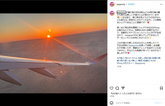 LINE/AIシステム開発コンサルティングや美容店舗サポートを行う株式会社ルナソル(本社:東京都港区、代表取締役:正殿桂一)は、LINEに画像を投稿するだけでキャプション・ハッシュタグをつけたSNS投稿を自動で生成・投稿するサービス「posty ポスティー」をリリースしました。