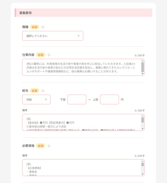 「ケアぴた」では、直感的に使いやすい画面設計と、求人作成をサポートする例文やガイドを完備しています。