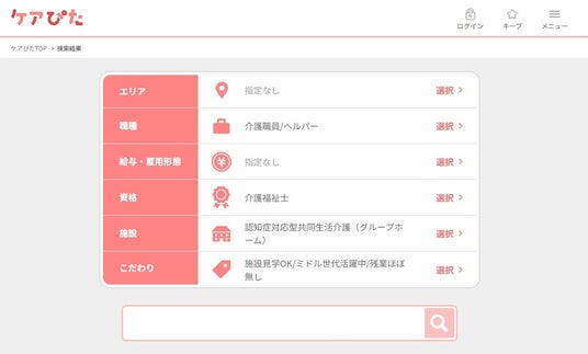 「ケアぴた」は福祉・介護分野に特化した求人サイトだからこそ、求職者と施設の双方が業界特有のニーズに応える検索機能を利用できます。