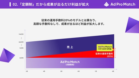 独自のデータベースを活用し、「商材経験」と「商材実績」に基づいて最適な広告のプロ人材を提案。事業成長に限りなく近いプロとのマッチングを実現します。一般的な広告運用手数料(20%モデル)とは異なり、成果が出るほど利益が拡大する定額制モデルを採用。