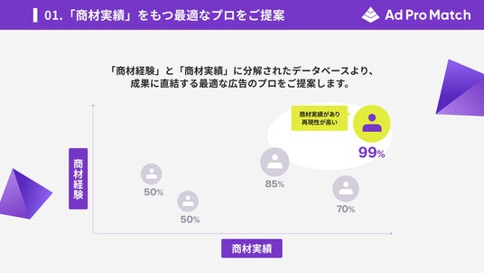 「商材実績」をもつ最適なプロをご提案「商材経験」と「商材実績」に分解されたデータベースより、成果に直結する最適な広告のプロをご提案します。