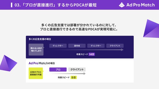 「プロが直接進行」するからPDCAが最短多くの広告支援では部署が分かれているのに対して、プロと直接進行できるので高速なPDCAが実現可能に。