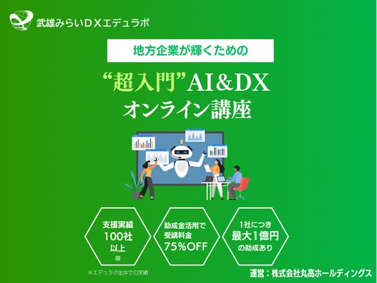 株式会社丸高ホールディングス(佐賀県武雄市)は、地域みらい総研株式会社(東京都港区)と連携し、DX(デジタルトランスフォーメーション)およびAI研修サービス「武雄みらいDXエデュラボ」を開始いたします。まずは自社グループ企業向けに研修を提供し、その成果を基に、より広く地域企業や全国企業に向けてサービスを拡大していく予定です。