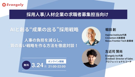 Evangely株式会社(所在地:東京都渋谷区、代表取締役:左近司賢尚 以下、Evangley)は、AIの専門家 堀田 創 氏とともに、採用市場におけるAIの活用に関する最新のトレンドや実践的な採用戦略設計について議論するウェビナー(参加無料)を開催いたします。