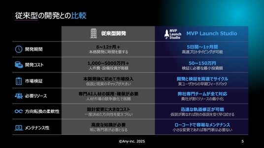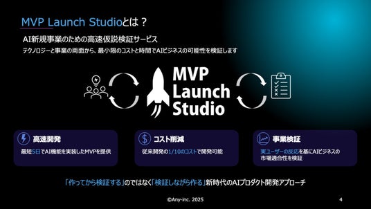 株式会社エニー(本社:兵庫県尼崎市西長洲町 3-3-10、代表取締役:松永 亮)は、最短5日・固定価格50万円からAIを活用したMVP(Minimum Viable Product)を開発できる新サービス『MVP Launch Studio(エムブイピー・ローンチ・スタジオ)』を、2025年5月より提供開始しました。