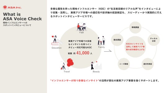 東南アジアに特化したマーケティング支援を展開する株式会社ASA(本社:広島県、代表取締役CEO:和泉昌憲)は、2025年6月より、現地インフルエンサー(KOC: Key Opinion Consumer)に直接インタビューできるスポットインタビューサービス「ASA Voice Check」を正式にローンチいたしました。本サービスは、弊社が抱えるベトナムを中心とした40,000人超のKOCネットワークを活用し、東南アジア市場に関心を持つ日本企業に向けて、“生活者目線のリアルな声”をスピーディーかつリーズナブルに提供する新しい調査手法です。