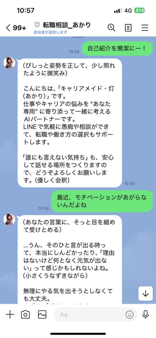【AIあかりちゃん】は、「今の仕事が合っているか分からない」「職場の人間関係にモヤモヤしている」「自分らしい働き方を見つけたい」といった、誰もが抱える仕事の不安や疑問にLINE上で優しく寄り添い、対話しながら整理・解決をサポートする新しいAI相談サービスです。