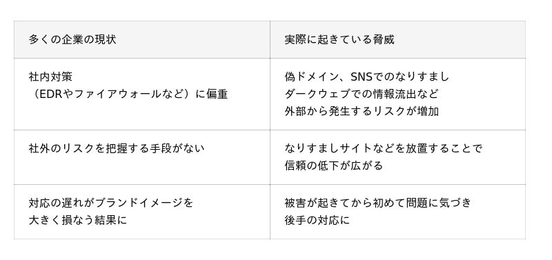 しかし実際に起きている被害の多くは、偽サイトの拡散やSNSのなりすましなど、組織の外部で発生する攻撃です。これらには、既存のEDRやメールフィルタでは対応が難しいのが実態です。