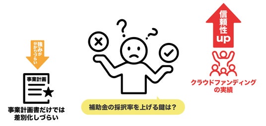 つまり、クラウドファンディングを先に実施することは、資金を確保するだけでなく、補助金の採択率を高める「実績づくり」の役割を果たすのです。企業にとって、補助金を有利に進めるための有効なステップとして位置づけられます。
