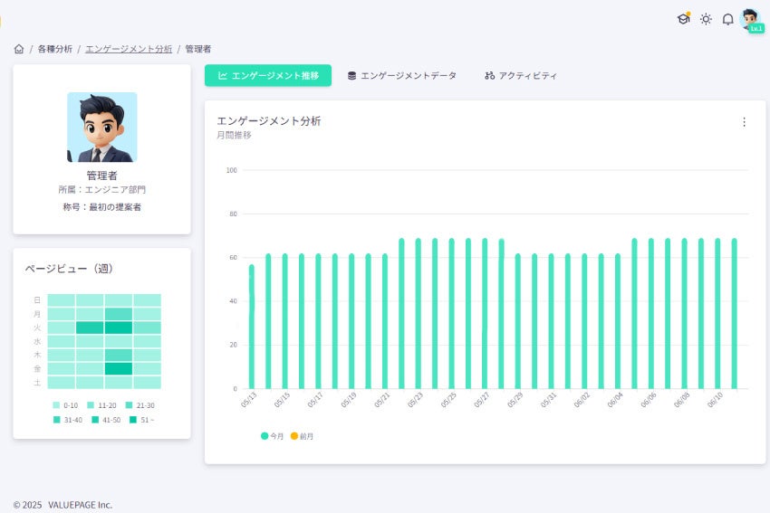 エンゲージメント分析機能Dropworkでは、ログイン頻度やクエストへの参加状況、コメントのやり取りといった行動データをもとに、従業員一人ひとりのエンゲージメント状態をグラフや指標として可視化します。