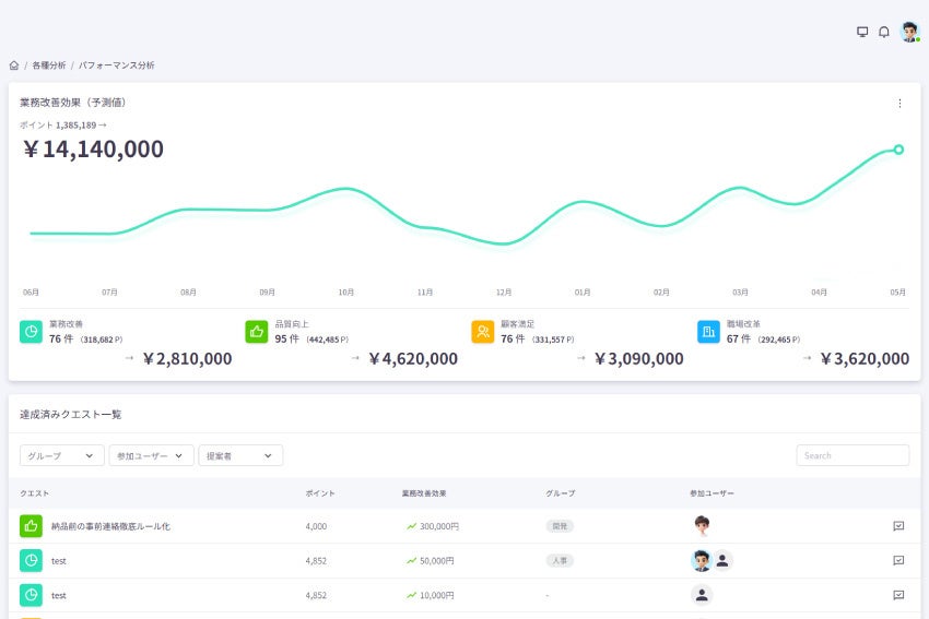 業績改善効果分析機能投稿されたクエストに対して、企業規模や業種に応じた業務改善効果予測をAIが算出。