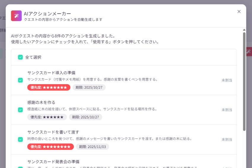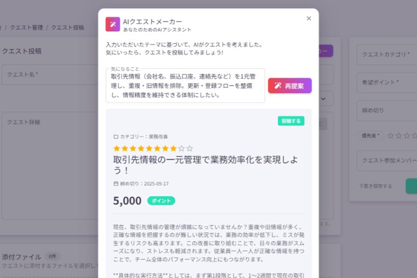 「チームの信頼関係を深めたい」といった漠然とした内容も、AIが適切なクエスト文案に変換・補助します。