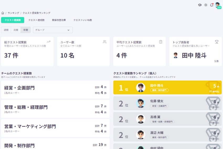 ランキング・表彰制度Dropworkでは、クエストの内容や実行状況をもとに、さまざまなジャンルのランキングを自動で集計し、頑張っている人を表彰できる仕組みを提供しています。