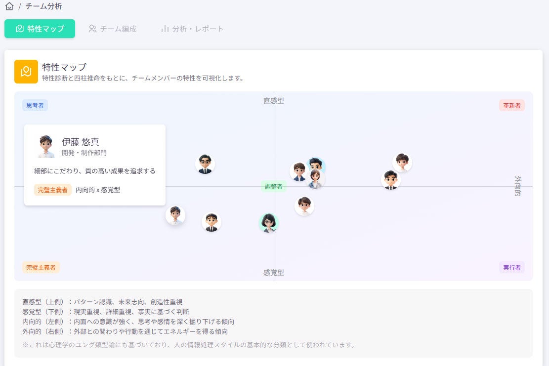 コメントリレー形式で意見をつなぐ仕組みや、匿名フィードバックによる称賛文化の醸成、さらには個々の資質に基づいたチーム構成の可視化な、