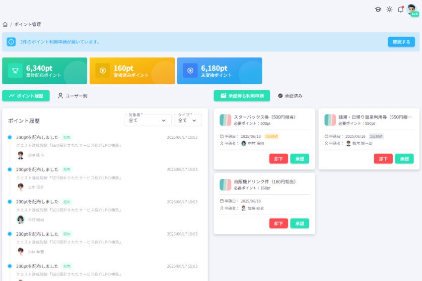 ポイント交換機能誰がいつポイントを獲得したかを確認でき、貯めたポイントを社内の報酬制度や特典と交換する仕組みです。