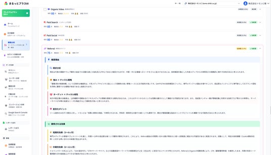6. Web施策・戦術の自動提案 - 全18チャネル対応、やるべき施策が一目瞭然自然検索・リスティング広告・SNS広告・ディスプレイ広告など全18チャネルに対応した具体的施策を自動提案。優先順位付きの6ヶ月実施タイムラインも自動作成します。