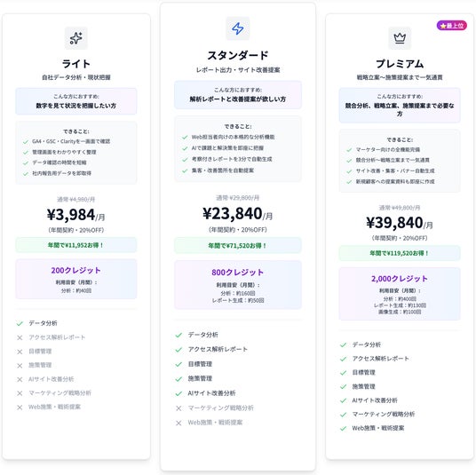 まるっとプラスAI のサービスページ■ 開発の背景「分析レポート作成に毎月30時間かかっている」「Googleアナリティクス・Googleサーチコンソール・Microsoft Clarityの3つのツールを横断して分析するだけで時間が消える」「戦略を立てようとしても、どこから手をつければいいかわからない」--。