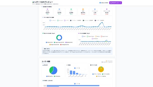 4. プロ級レポート自動生成 - 月30時間の作業が5分で完成全27ページの網羅的な分析レポートを、AIの考察付きでワンクリック生成。自社ロゴの掲載にも対応しており、代理店の方も自社レポートとしてそのままクライアントに提出できます。