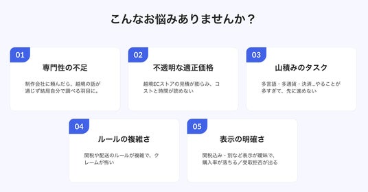 ■サービス提供の背景越境ECへの関心は高まる一方、実際に踏み出せない事業者が多い現状があります。その主な原因として、専門知識の不足・適正価格の不透明さ・関税や配送ルールの複雑さが挙げられます。制作会社に依頼しても越境特有の論点が共有されず、結局自社で調べ直すケースも少なくありません。