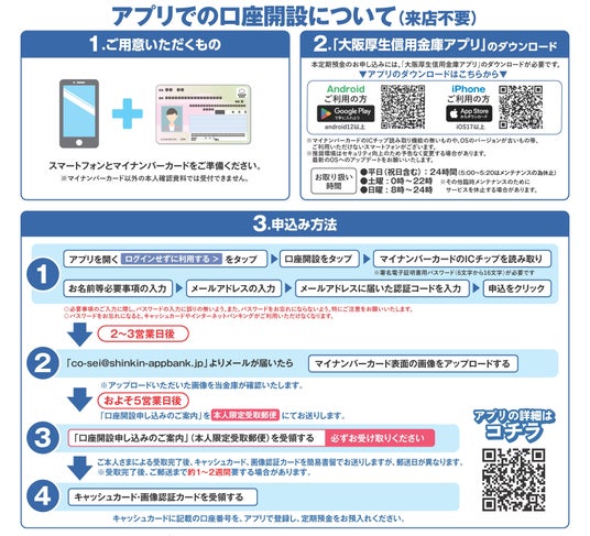 ・お申し込みには「大阪厚生信用金庫アプリ」のインストールおよび通帳レス口座のご契約が必要です。