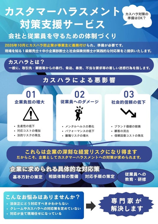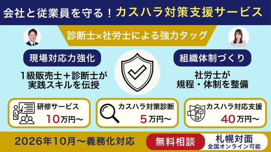 株式会社ブルーラーニング(本社:北海道札幌市、代表取締役:田邉 勇樹)と、bauming社会保険労務士事務所(所在地:北海道札幌市、代表:小清水 晶子)は、2026年10月のカスタマーハラスメント(以下、カスハラという)。防止義務化に向け、中小企業向け「カスハラ対策伴走支援サービス」の提供を開始しました。