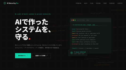 株式会社AntAI(本社:東京都渋谷区、代表取締役:石川拓也)は、AIツールで構築されたWebサービス・業務システムを対象とした専門監査サービス「AIセキュリティ顧問 Pro」(