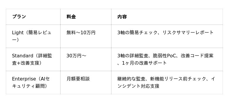 - 提供形態:オンラインでのコード・アーキテクチャ監査、レポート納品