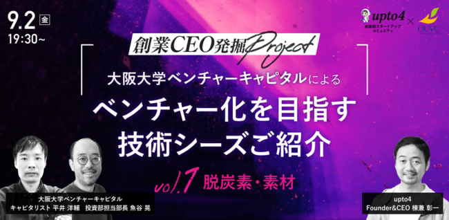 upto4株式会社(本社:東京都中央区、代表取締役社長:棟兼彰一 以下、upto4)は、大阪大学ベンチャーキャピタル株式会社(本社:大阪府吹田市、代表取締役社長:清水速水 以下、OUVC)と共同し、スタートアップの創業を目指す大学発最先端テクノロジーの事業化に向けた取り組み「創業CEO発掘プロジェクト」を開始しました。