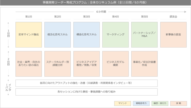 管理職や管理職候補の若手リーダーが、1か月に1度(2日間)のペースで集合し、6か月間に亘る様々なテーマ別セッションおよび実践を通して、事業構想リーダー/イノベーターとしての考え方やその手法を体得するプログラムです。最終回で業界や自社の未来を見据えた新事業案を現役幹部陣に提言し、その是非を問うことが最終アウトプットとなります。
