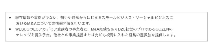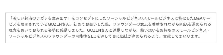 スモールビジネス・ソーシャルビジネス特化型M&Aサービス「ソーシャルM&A」を提供するGOZEN(ゴゼン) (東京都渋谷区、代表:布田尚大、以下GOZEN)は、Eコマース分野に誰もが挑戦できる環境を作ることを目標にECに関するあらゆる支援を行う株式会社WEBUO(福岡市中央区、代表取締役:黒田 友美、以下WEBUO)と通販/D2CのM&A仲介領域で事業提携いたしました。これにより、D2CおよびEコマース領域のM&Aにおけるソーシングプロセス(売却・買収候補となるターゲット企業のリサーチと交渉)を拡充・強化いたします。