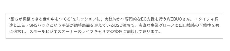 WEBUOは、Eコマースの教育事業・伴走型運用支援・コーポレートサイト、ECサイトなどのWebサイトのブランディング戦略等、ECに関するあらゆる支援を行っています。