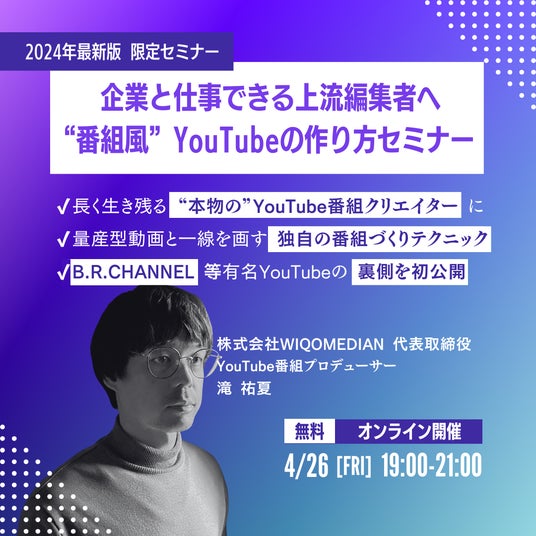 株式会社WIQOMEDIAN(本社:東京都中央区、代表取締役社長:滝 祐夏。以下、WIQOMEDIAN)は、動画クリエイター/動画編集者/制作ディレクターなどの動画制作者に対し、4月26日(金)19時よりオンラインセミナーを開催します。B.R.CHANNEL、ウンTube、be WOMANch などユニークな企業/ブランドチャンネルの企画・制作・運用の裏側や、独自の番組づくりの秘訣をお伝えします。