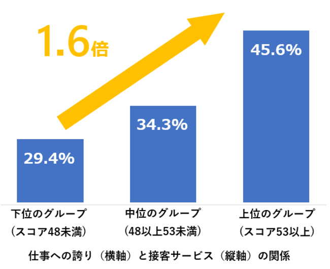 調査の結果、ワークエンゲージメントの要素である「仕事への誇り(自分の仕事に「誇り」を感じているか)」のスコアが高い企業は、優れた顧客体験(CX)を提供できている比率も高くなっていました。顧客から「接客サービスが期待以上だった」と感じられる割合は、「仕事への誇り」が上位のグループ(スコア53以上)と下位のグループ(スコア48未満)では約1.6倍の差があることがわかりました。