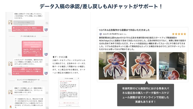 実際のお取引事例では、見積もり相談から掲載完了までの全メッセージ22件のうち、実に半数の11件がAIチャットによる自動メッセージで行われており、お客様は5通、出品者は6通だけメッセージを送るだけで、「(1)見積り込みでのパネル広告制作・(2)パネル広告の店舗配置・そして(3)追加料金(送料)の支払い・(4)スケジュール調整」という複雑な掲載案件を完了することができています。