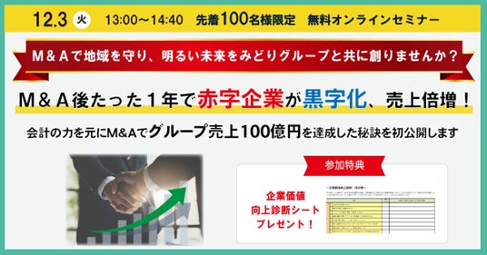 株式会社みどり未来パートナーズ(本社:香川県高松市、代表取締役会長:三好貴志男、代表取締役社長:澤田兼一郎、以下「みどり未来パートナーズ」)は、12月3日(火)13時から、「M&Aで地域を守り、明るい未来をみどりグループと共に創りませんか?」と題したオンラインセミナーを開催します。本セミナーでは、M&Aで地域企業の明るい未来を創るため、M&Aを実際に実行した講師がM&A成功に至るまでの課題や解決策など「リアルな企業運営」に加えて、「M&A詐欺を防ぐためのM&Aアドバイザーの選び方」をお伝えします。
