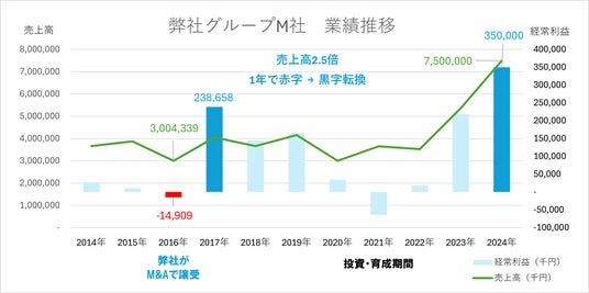 下記のグラフの通り、弊社グループがM&Aで譲受したM社はM&A後の翌年から赤字→黒字転換し、売上高は譲渡時から2.5倍に増加しています。