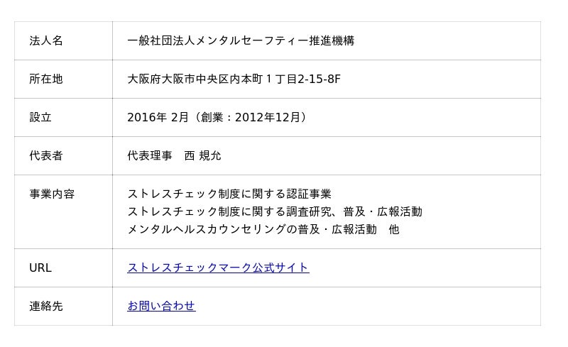 一般社団法人メンタルセーフティー推進機構(代表理事:西 規允、以下「当法人」)は、労働安全衛生法および厚生労働省の指針・マニュアルに準拠したストレスチェック制度を適正に実施し、自己評価を行った事業者に対し、当法人が定める「ストレスチェックマーク(R)」の使用を認める新たな取り組みを開始しました。