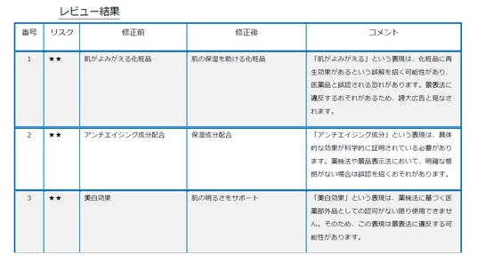 本サービスの審査の基となるデータベースは、2016年の広告審査サービス開始から蓄積されたA4サイズ1000枚以上の広告、1万か所以上の指摘箇所を元に構築されています。この豊富なデータに基づき、AIが広告を迅速にチェックし、法令違反の可能性がある箇所を検出します。