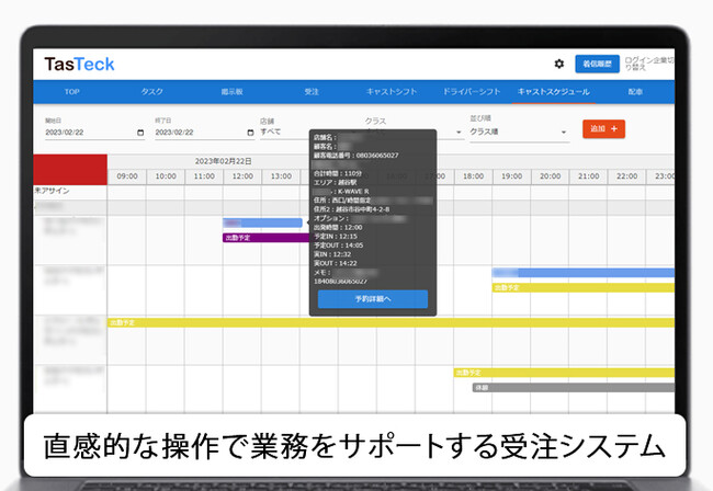 「タステック」では分析機能だけでなく、とにかく煩雑になりがちな店舗での受注・顧客管理業務を効率化するための機能も充実しています。直感的にドラッグ&ドロップで登録できる受注スケジュール及び配車スケジュールページや、セラピストやドライバー自身が自分で簡単にシフト登録ができるセラピスト・ドライバー専用のスマートフォンページなど、日々の受注業務の負担を極力軽減できる機能を取り入れています。