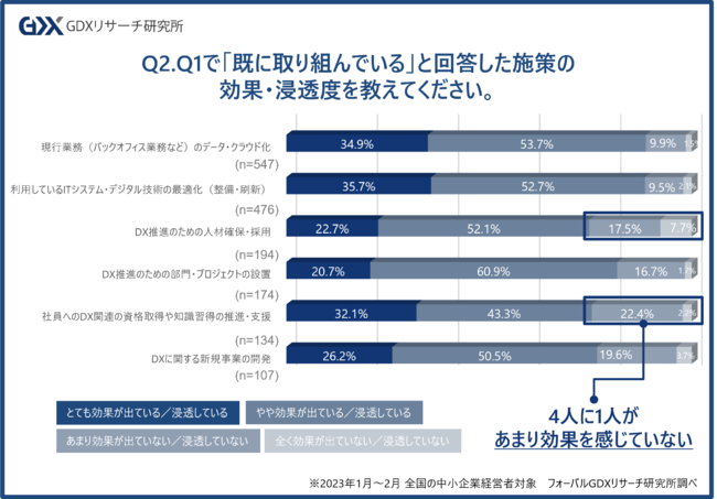 2.中小企業経営者の4人に1人が、 「社員へのDX関連の資格取得や知識習得の推進・支援」「DX推進のための人材確保・採用」 にあまり効果を感じていないと判明!リスキリングの内容、やり方も重要