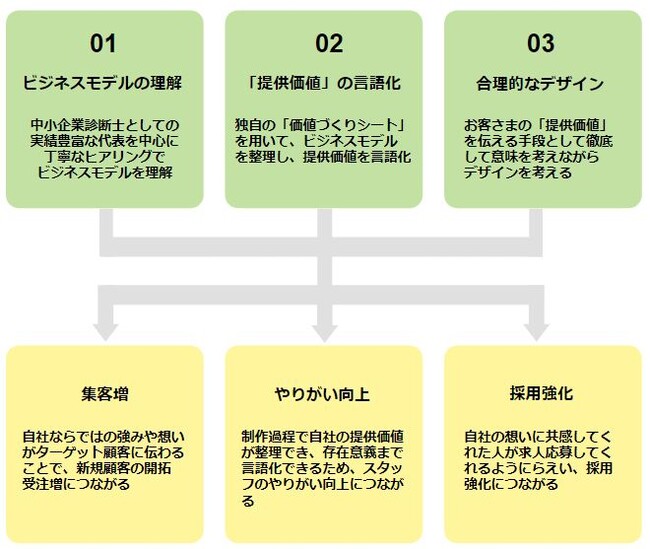 そのうえで、その会社の、その商品の「らしさ」を定義し、それがきちんと伝わる「カタチづくり」(ブランディング&デザイン)をすることで、「共感」を増やし、新規顧客の開拓に結び付けていきます。